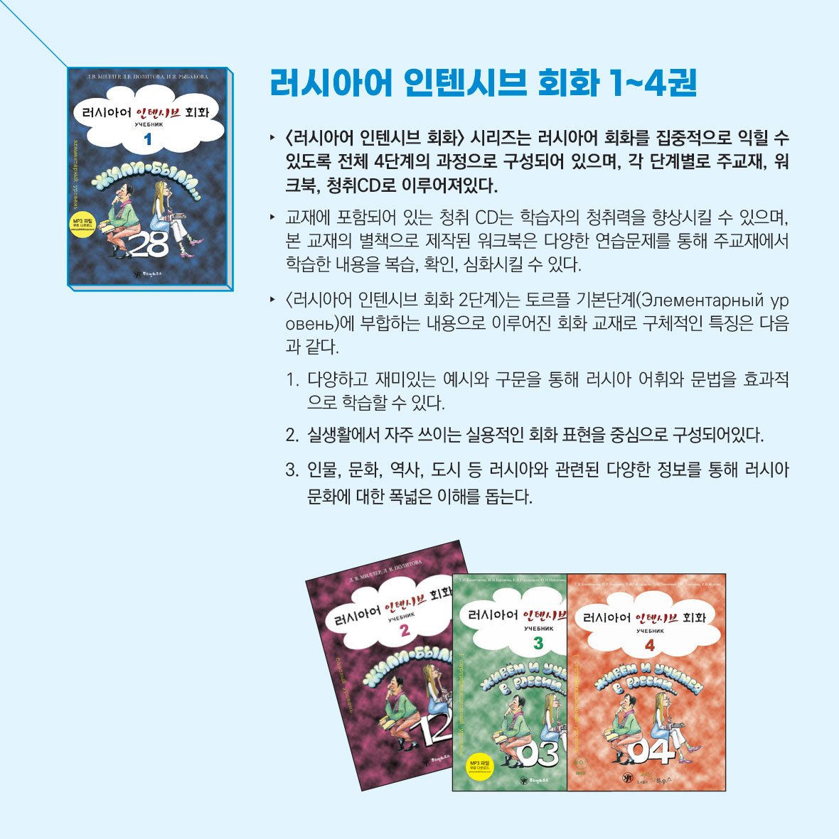 일상생활에 필요한 현대적 테마를 위주로 기초 러시아어를 익힌다